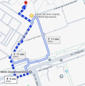 The Annexus building is the basement of A1, but the access is from the Gran Capità street, not from the ground level at A1). Take the metro or the tram, stop at Zona Universitària and it's less than a 10 min walk. The path is totally accessible, including the metro station (there are elevators to the platforms and the street) and the A1 building (street level).