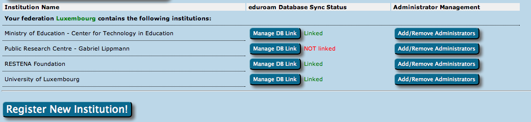 If you created a new IdP instead, then this new IdP will not (ever) be linked automatically to an entity in the eduroam database. Once the IdP is in production and becomes listed in the eduroam database, you can add the link yourself by pushing the same "Manage DB link" button.