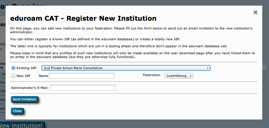 The button on the lower end of the page allows you to send an invitation to use eduroam CAT to an IdP in your federation. This can either be an IdP which is already in production (i.e. already listed in the official eduroam database with at least the "IdP" role) or it can be a new institution which is still in a bootstrapping phase (i.e. not yet registered in the official eduroam database).