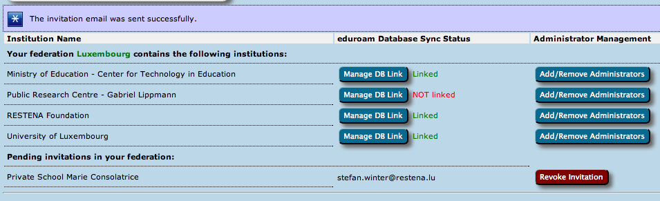 When an invitation has been redeemed, all federation administrators of your federation will receive an email notification by eduroam CAT confirming that a new IdP was created.