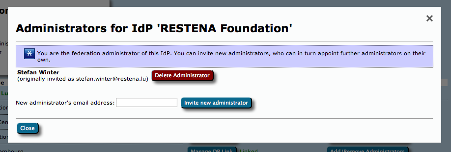 You can immediately add yourself as an IdP admin for each IdP in your federation by using the "Add/Remove Administrators" dialog box. For federation administrators, the dialog box has an additional button "Take control of this institution". By simply clicking this button, you will instantly become IdP administrator of this institution. Most notably, you do not need to send an email invitation to yourself; the process completes instantly.
