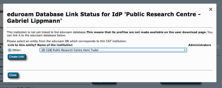 Simply select the appropriate entry from the dropdown list and click on "Create Link" to link the IdP as seen by eduroam CAT to the entity as seen by the eduroam database.