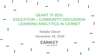Thursday, 26 November 2020 from 10:00-11:30 CET | Learning Analytics for Schools, short overview of CARNET solution and discussion about community experiences | Nataša Glavor, CARNET | Recording (only the presentation part): https://geant.box.com/s/4nnciqzloczxaw5yla9274cnr65ogiuw Presentation: |