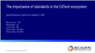 Thursday, 7 January 2021 from 14:00-15:30 CET | The importance of standards with the EdTech ecosystem All over the world, ICT is used more and more within education, especially during the COVID pandemia over the last year, where online education has become so important. To add educational value, many new ICT tools have been implemented at the universities, forming the so-called EdTech ecosystem. In order to make this EdTech ecosystem easy to create, reliable, flexible, future proof and accessible to all, it is essential to also focus on interoperability between tools, sharing data, data governance and accessibility. The easiest and most sustainable way to do this, is to work with existing and well-adopted EdTech standards (agreements). IMS Global is a community of institutions, vendors, schools, publishers and other EdTech related partners, that has developed a series of well adopted EdTech standards and tools, to help you to create a robust EdTech ecosystem. Examples are LTI, OpenBadges, EduAPI and QTI and the App Vetting tool. These standards form the foundation of the EdTech ecosystem, LTI for example defines the interoperability between tools on a detailed level. By leaving this interop In this session, we will share some practical examples of standards, introduce some of the relevant EdTech standards and discuss how you as an institution can benefit from them. Finally, we will listen to some of the members of the community on how they contribute to the IMS Global community and discuss with you what role you could play in there. To get inspired for this session, we recommend to watch this video of the Technical University of Eindhoven. A more detailed information document on the standards of IMS Global in relation to Géant is here. This document was created based on questions asked at the Géant Education TF meeting in Budapest, November 2019. | Nynke de Boer (IMS Global) Michael Webb (Jisc) Jasmijn Jacobs-Wijn (SURF) Wietze de Vries (Sunet) | Recording (only the presentation part): Presentation: Links: http://www.imsglobal.org/event/europe/2020 http://www.imsglobal.org/europe2019/presentations https://www.youtube.com/playlist?list=PLysC4Zd9-FmD773cUYratfgiwBtLGr7Jb http://www.imsglobal.org/dc/summit/2021 https://www.eduhub.ch/events/SWITCHverify-and-blockchain-basics/ https://docs.google.com/document/d/1DASCcO1vIyjzlTO7XES23mNRfFvXGT824dtIrLxWvTg/edit |