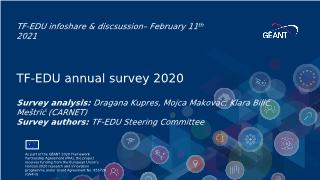 To open the session, we will have a short presentation on the previous TF-EDU survey on education services and activities, followed by TF-EDU Steering Committee members giving their experiences of the services they or their institutions have found useful, their needs and their challenges, concluding with an info share regarding the launch of the 2021 Annual Survey. Discuss with us the topics and themes that spark the interest of our community (and that is you as well) and how you can be engaged in future TF-EDU activities. | Recording: Presentations: | |