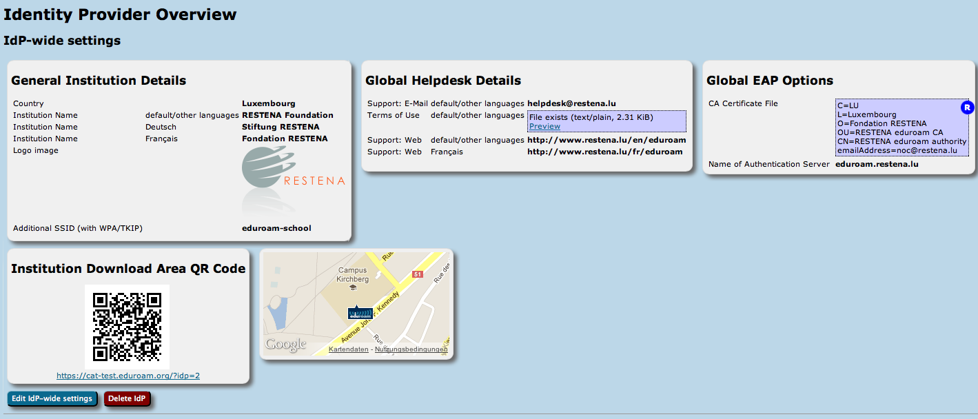 Depending on installers used it is possible to enable customisation which includes your IdP's name, location and logo, contact details for your helpdesk. Of course the main purpose of configuration is to provide the RADIUS settings which users need to uniquely identify your IdP when roaming. The installers can be produced in many languages; that way, you can even offer your users an installer in their native language! Further to that, eduroam CAT can also assist you in debugging your own RADIUS setup by comparing your inputs to the actual behaviour of your setup in the eduroam infrastructure.
