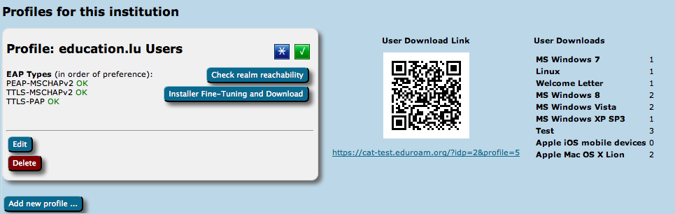 eduroam CAT can make the end-user installers available on its own user download area, or you may choose to download them yourself and distribute them on your institution's own web page. You can also choose to make only a subset of the supported platforms available for direct download, while redirecting users of select platforms to your own support page (e.g. if you have custom installers with non-standard specialities for these platforms).