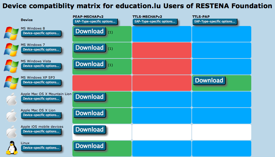 For some devices, there is little we can do, since they either do not support proper automatic configuration, or for various reasons such support cannot be used by CAT. For some select devices in that class we still offer the possibility for administrators to set a redirect target for this device. Administrators can then create a dedicated support web page to which the user will be sent for local instructions. You can find the list of these devices on the "Installer Fine-Tuning" page (see below); more devices can be added by the eduroam CAT operators; if you see a need for that please contact cat-users@lists.geant.org.