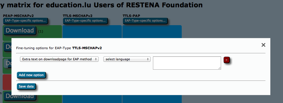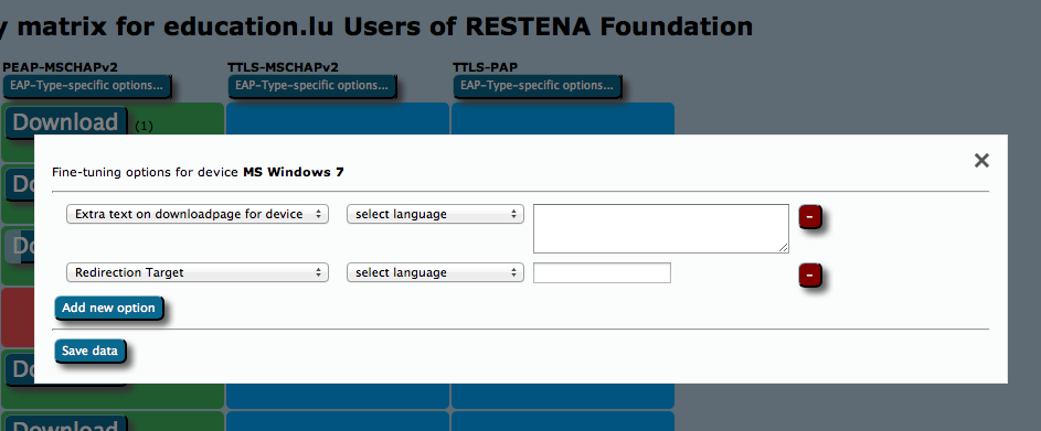 For all these options, the Fine-Tuning page has extra buttons: you can add free-text for either specific EAP Types or specific devices. This text will then be displayed on the user download page before the download begins. For devices, you can also specify a Redirect target; if this is set, CAT will not provide a download button, but instead will redirect users to the URL you specified. This could, for example, be useful if you have a custom-made or commercial installer for one of the devices, and don't want to use CATs services for that device. If this option is set, the background for this device will turn white in the matrix (see screenshot above).