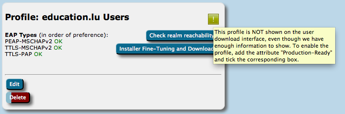 The visibility status of your EAP deployment is indicated with either a green (published) or yellow (unpublished) status icon on the Profile info (see screenshot). If the status is yellow, you can hover with your mouse over it to get a more detailed explanation why the profile is not published.