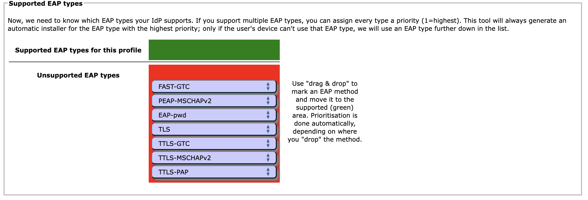 The third part of profile generation is about the EAP types which you've configured in your RADIUS server for this user group. By simple drag&drop, please drag all the EAP types you support into the upper green area. The list is ordered by preference, so drag the EAP types into your preferred order. The CAT will always compare the EAP types you've configured here with the capabilities of the various devices which are to be configured. If the device supports your most preferred EAP type, installers will always be generated for that EAP type. If your preferred EAP type does not work on a given device, the preference list is worked through until a match occurs, and then installers for that device will use that not-so-preferred EAP type (which is better than not supporting eduroam configuration at all). Finally, if there is a complete mismatch between the EAP types you support and the EAP types on a device, then we can't generate installers for that device. You might be luckier if you can change your RADIUS setup to support more EAP types then.