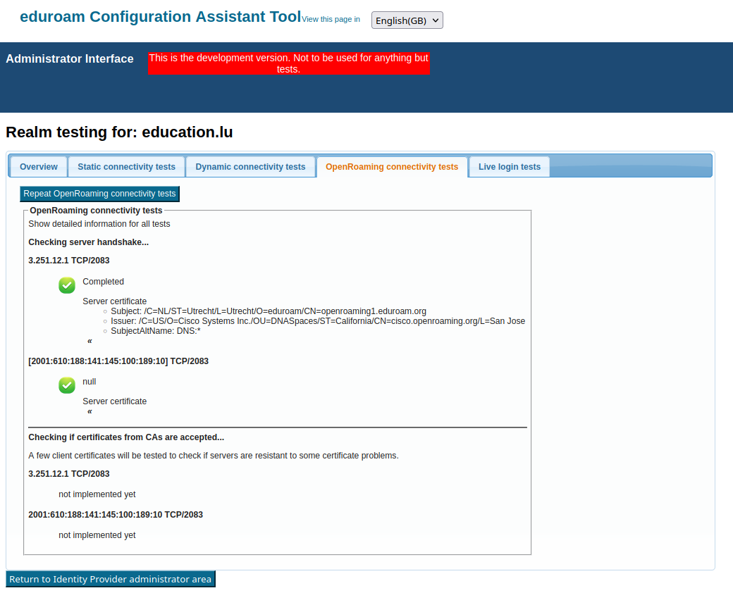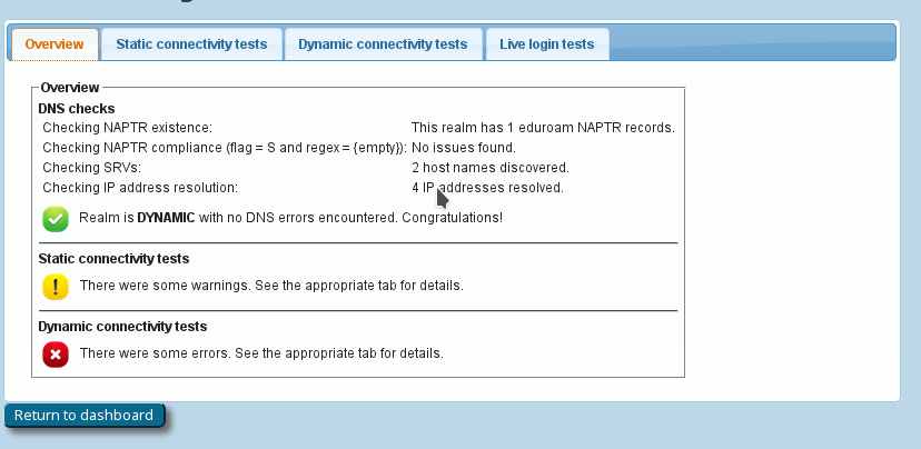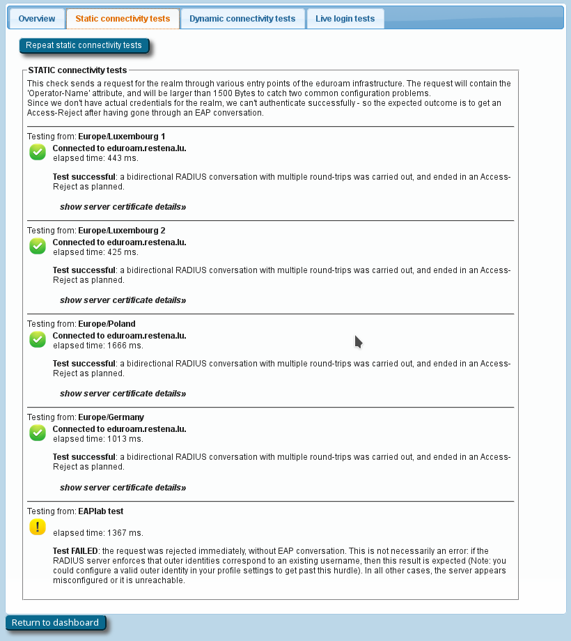 The tests will take a few to several tens of seconds, and will give you an in-depth overview of how your RADIUS server is doing in the world of eduroam. The tests include