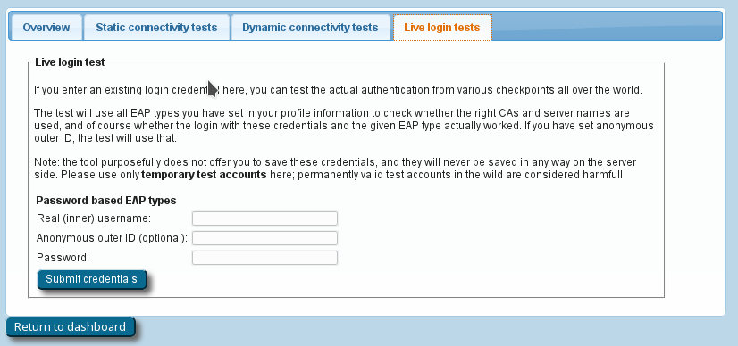 If you have supplied the CAT with the realm which you are using in eduroam, an extra service is enabled for you: the CAT can send live data probes through the eduroam infrastructure to see if your realm's RADIUS server is reachable and whether it passes various sanity checks. All these tests are triggered by pushing the button "Check realm reachability". You will be presented with an overview page immediately while various tests are executed in the background: