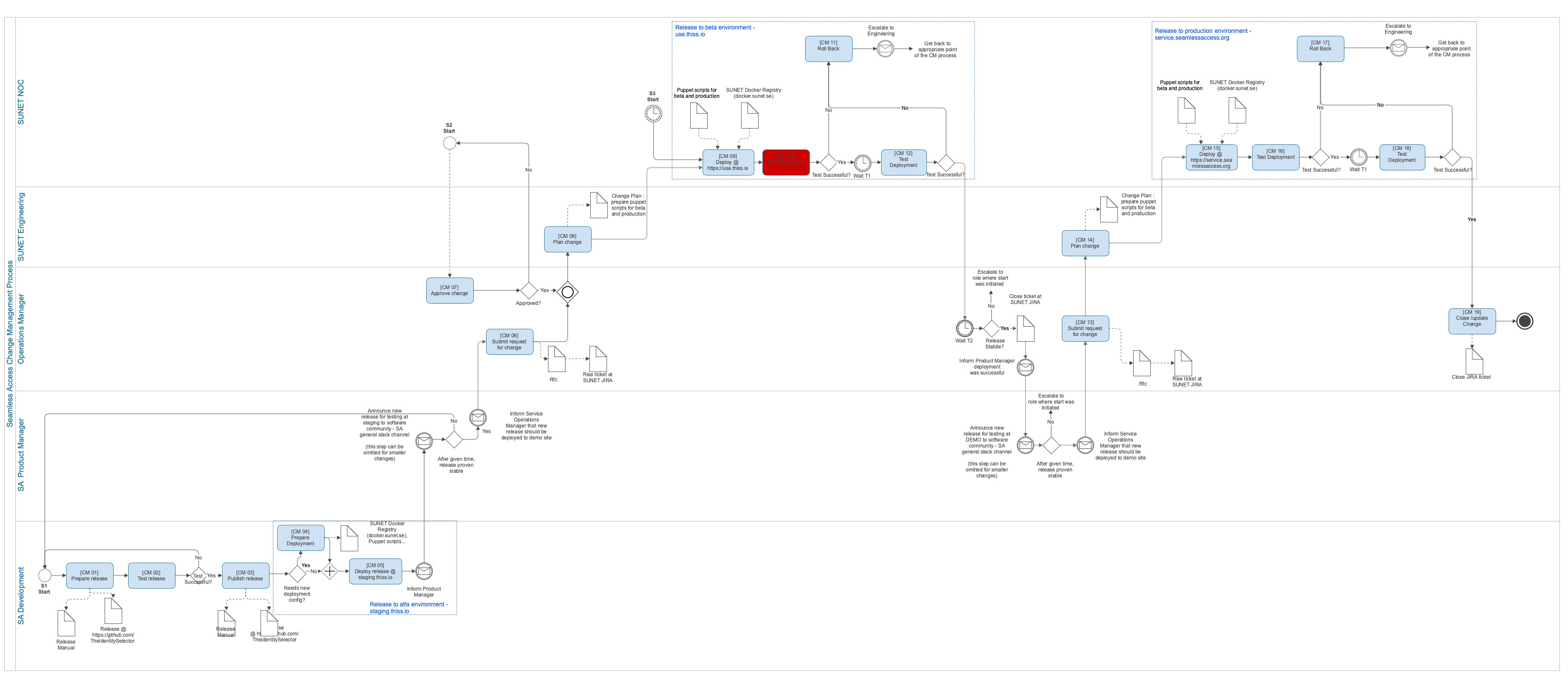 - CM 10: Smoke tests are performed using the SA monitoring. The deployment has to be monitored for T1 proceeding with the change workflow. In case of any issues and if the change was initiated by Seamless Access the Service Manager will be notified. JIRA ticket is updated.