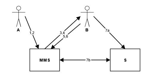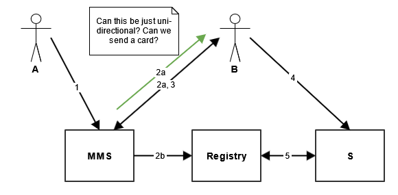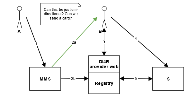 With this solution, B does not have to use the same login (i.e. the MMS and the target S do not need to be in the same federation). Possibly, B can receive the card at a page maintained by the DI4R provider.