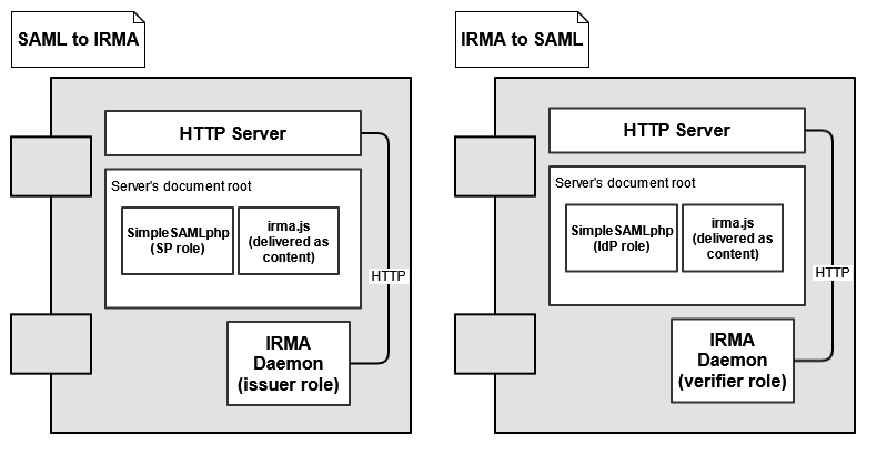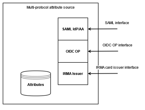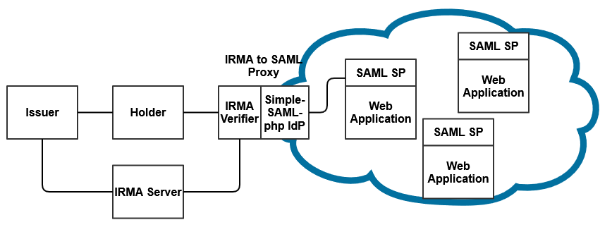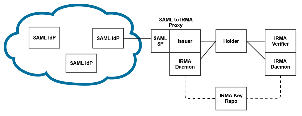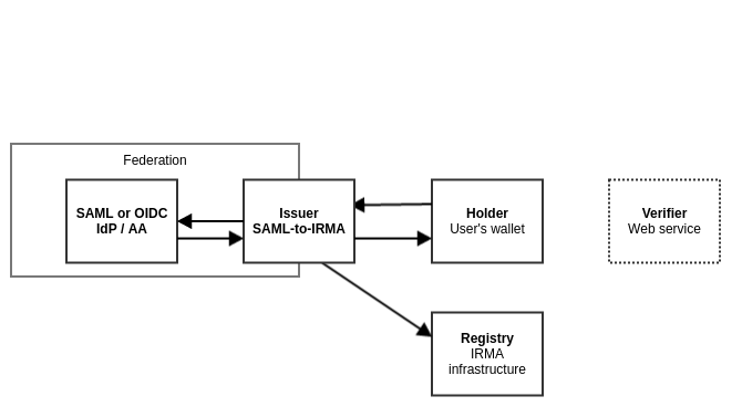 The arrangement works the other way around too: SAML-to-IRMA proxy provides the possibility of using a SAML federated account to get IRMA cards.