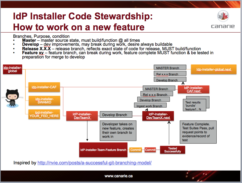 | Versioning / hosting | We use semantic versioning ( http://semver.org/ ) as our pattern followed by -<federation-short-name> Attached is our approach to code stewardship. Inspired by a reference we came across but also by Janusz @ HEANET with jagger. | Hosted on github workflow from dev to stable: | All our software as soon as it’s passed version 0.1 can be found on github. On github we bind a couple of services to each project: - Landscape (https://docs.landscape.io/index.html) - ReadTheDocs (https://readthedocs.org) - Travis CI (https://travis-ci.org) We do frequent releases of new versions using the classic major.minor[.build[.revision]] version format. We aim for small incremental updates. | ||
