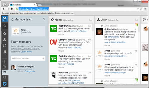 - Twitter users produce a lot of post so make sure you use tools like Tweetdeck: https://tweetdeck.twitter.com/. They will help you navigate through the information noise and manage multiple accounts and hash-tags. The most important feature with Tweetdeck you should use is "Teams" feature, where you can assign editorial or administrator roles to other twitter users without disclosing your account username and password. More info: https://blog.twitter.com/2015/introducing-tweetdeck-teams?utm_campaign=OT_PU_CON_TweetDeck_US_Teams&utm_medium=email&utm_source=Eloqua Make sure the future editor is logged into Twittdeck before he clicks (confirms) his role through email.